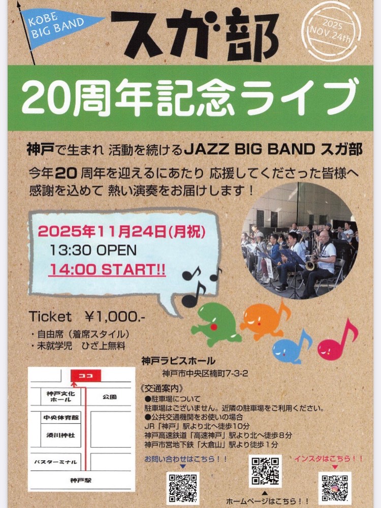 20周年ライブ 2025年11月24日(月祝) 2025.09.30<記念ライブのお知らせ>2025年11月24日(月祝)スガ部20周年記念ライブat ラピスホール(大倉山)チケット販売中です!チケットは部員までご連絡ください!